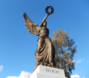 The first antiquity we came upon was the Nike Trophy, a reconstructed marble obelisk located near the spot where in 490 B.C. the Athenians amazingly defeated the Persians even though outnumbered three to one. (Nike means “victory” in Greek). In contrast to trophies in battles between the Greek city-states in which the armor of the defeated was hung on a tree trunk, the trophies of the Persian Wars were grandiose monuments.